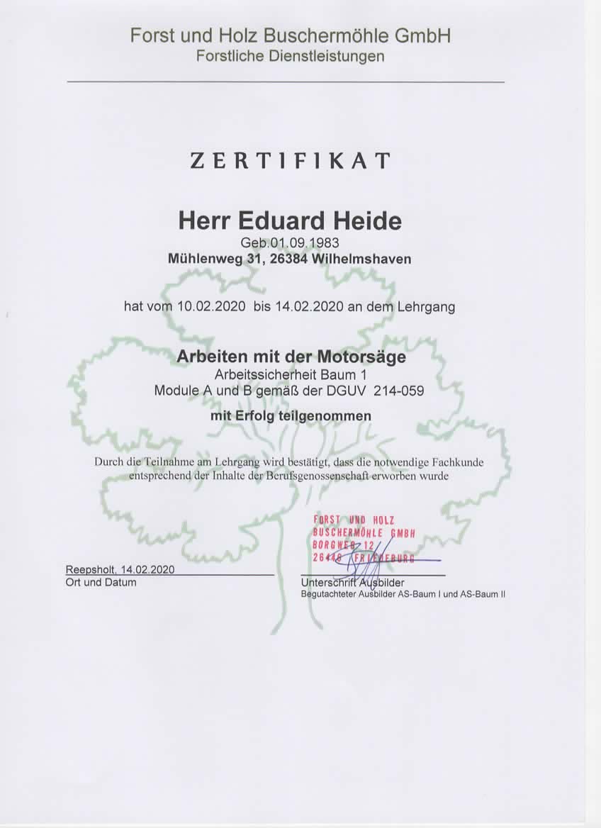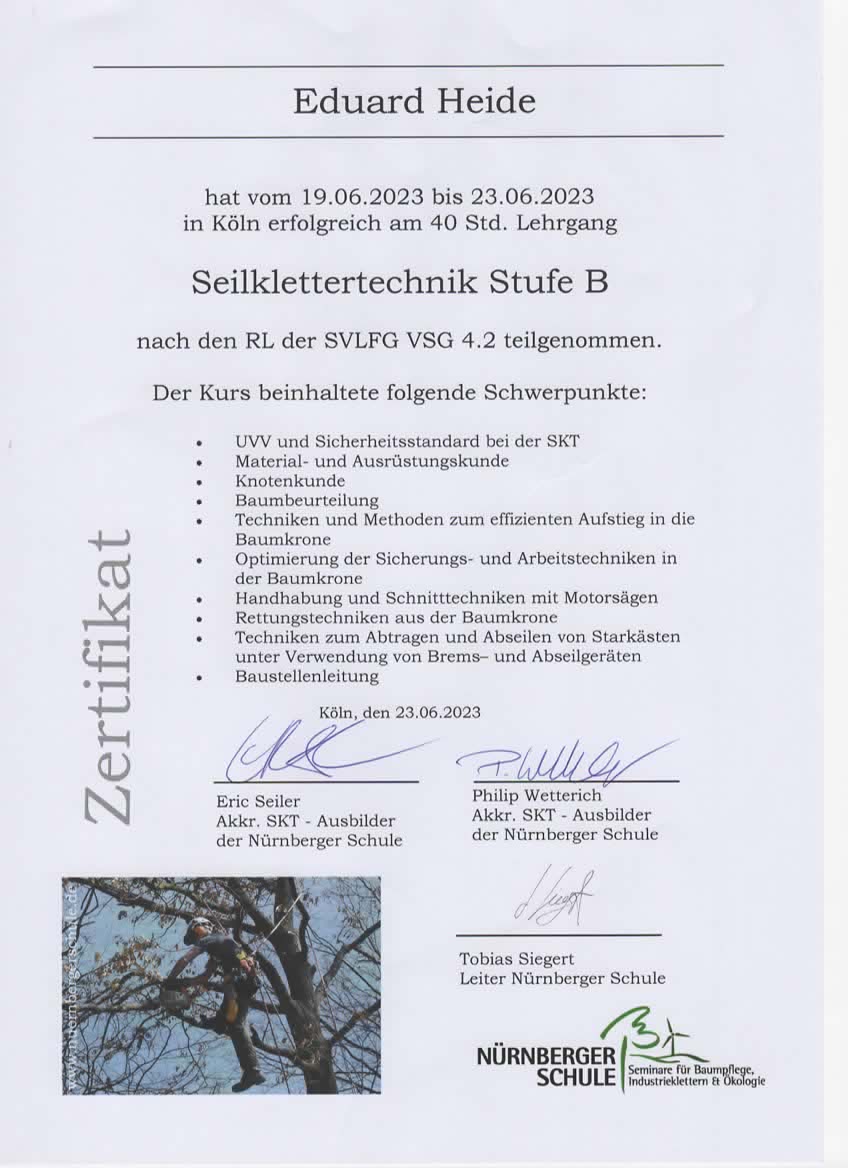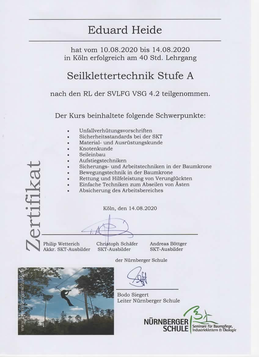Qualifikationen sind für uns elementare Bestandteile, um sicher Baumkletterer- und Baumfällarbeiten durchzuführen. Eine Auswahl der wichtigsten Qualifikationen ist nachfolgend zu sehen: